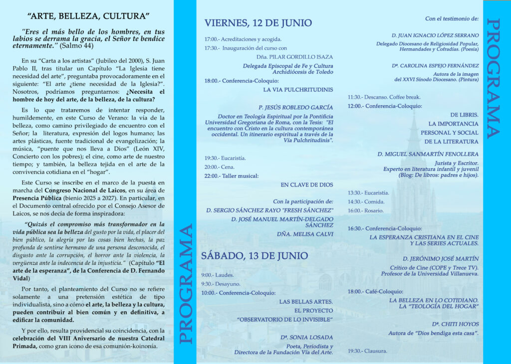 El XI Curso de Verano este año, titulado «ARTE, BELLEZA, CULTURA» hará un recorrido por la vía de la belleza como camino privilegiado de encuentro con el Señor, planteando cómo podemos contribuir a través de este camino al bien común y a edificar comunidad.